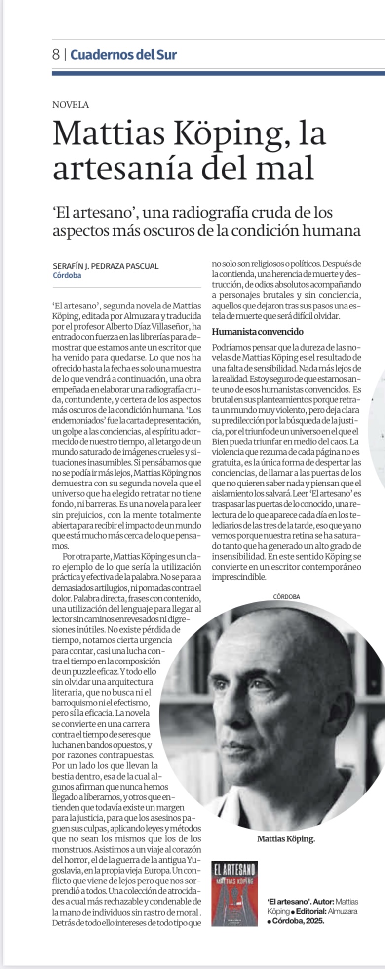 Tras el éxito de «Los endemoniados», Mattias Köping, considerado uno de los maestros de la serie negra más oscura, nos sorprende con su nueva novela, «El Artesano», ganadora del Premio Découverte Iris Noir de Bruselas en 2019 y del Premio Polar de los Bloggers, entre otras distinciones.