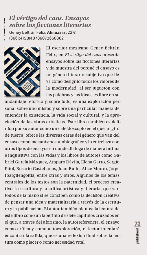A la manera de un caleidoscopio, este libro entrega un amplio catálogo de abordajes a los laberintos de la ficción. Itinerario en que conviven ensayos críticos, estampas personales y brevedades de signo aforístico, El vértigo del caos revisa un puñado de obras notables en que se ofrecen inquietantes representaciones de la rebeldía, la violencia, el poder, los afectos, la paternidad y la aniquilación de lo humano. Teniendo como trasfondo el asesinato del periodista Javier Valdez en Culiacán en 2017, estas páginas siguen también las huellas que el vivir y crecer en ciudades y regiones latinoamericanas dominadas por la violencia han dejado en el lenguaje, la imaginación y la reflexión de quienes, como el autor de este libro, asumen pasado el tiempo la vocación de las letras. Señalado por Ignacio M. Sánchez Prado como “una de las inteligencias críticas más lúcidas y frenéticas en nuestra literatura”, Geney Beltrán vuelve a la escritura reflexiva con esta apasionante travesía que, merced a la brillante confluencia de la argumentación, la memoria y la sensibilidad, abarca distintos siglos y horizontes, de Cervantes, Camões y Emily Brontë a Toni Morrison, Alice Munro y Gabriel García Márquez.