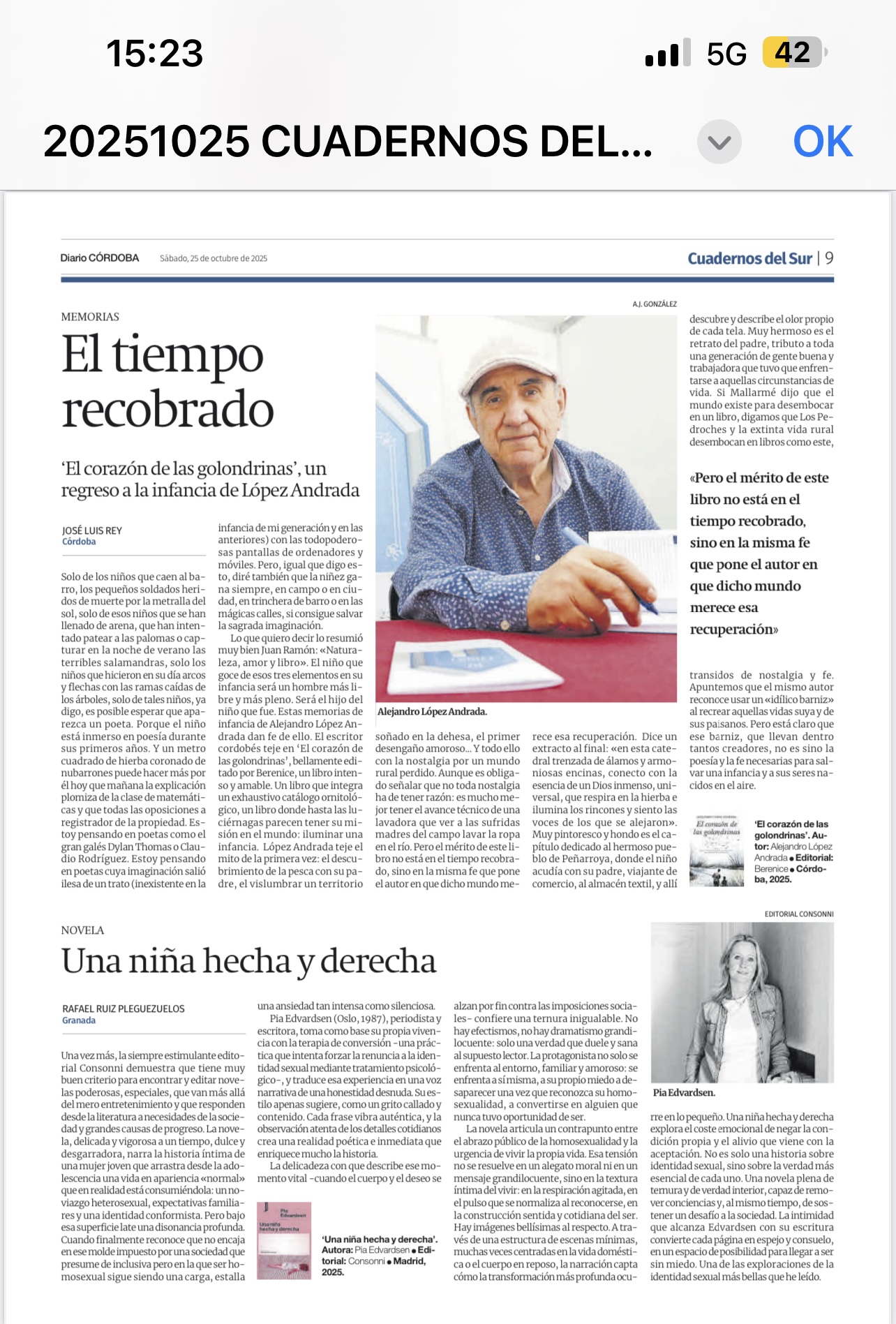 A través de recuerdos imbuidos de ternura y asombro, López Andrada retrata la estrecha relación del ser humano con la tierra y los animales, especialmente con las aves, esas mensajeras del cielo que marcaban las estaciones y habitaban los sueños de la infancia. Su prosa, impregnada de nostalgia y belleza, no solo reconstruye un paisaje perdido, sino que nos invita a reflexionar sobre el contraste entre aquella existencia sencilla y el presente acelerado que en la actualidad vivimos.