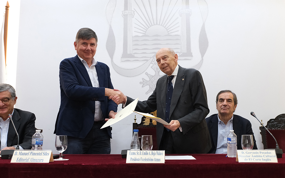 ![]() El Premio de Novela Ateneo de Sevilla y el Premio de Novela Joven Ateneo ya tienen nueva editorial. En la mañana de hoy, el presidente del Excmo. Ateneo de Sevilla, D. Emilio A. Boja Malavé, y el editor de Almuzara, D. Manuel Pimentel, han formalizado la firma del convenio de colaboración por el que la editorial cordobesa pasa a ser editora y coorganizadora de los Premios, en ambas modalidades, por un periodo inicial de cuatro años con vocación de continuidad. Con esta alianza se abre una nueva etapa de desarrollo de estos premios, enfocada en alcanzar una mayor difusión tanto de los galardones, como de las obras ganadoras, haciendo de él uno de los eventos literarios del año. D. Francisco Prior Balibrea, vocal de Publicaciones y Difusión Cultural del Excmo. Ateneo de Sevilla y responsable de los Premios en la institución ha destacado “la sintonía y facilidad en el proceso de diálogo con Almuzara y sus representantes”, así como la confianza de los patrocinadores que, un año más y tras conocer el nombre de esta nueva alianza, seguirán colaborando en los Premios de Novela. Por su parte, Pimentel ha hecho hincapié en lo que esta apertura editorial supone para Almuzara “un importante hito en la historia de la editorial que conlleva una enorme responsabilidad, ya que vamos a ser los herederos de grandes editores de premios anteriores”. El Ateneo es un premio de prestigio de mucha notoriedad al que pretendemos darle un nuevo impulso internacional”. En la firma han estado presentes los representantes de las entidades patrocinadoras del premio: D. Francisco Cañadas por Fundación Unicaja, y D. Gervasio Posadas desde Ámbito Cultural (El Corte Inglés). Aumento de la dotación Además, en el acto se ha procedido a la publicación oficial de las bases para la próxima edición 2025, disponibles en la web tanto del Ateneo de Sevilla como de Almuzara desde el día de hoy y en la que ya está involucrada Almuzara. Para esta próxima edición, el Premio de Novela Ateneo de Sevilla contará con un aumento de la dotación llegando a los 25.000 euros para el ganador, que se anunciará como es tradicional en una cena literaria en los Reales Alcázares de Sevilla durante el próximo mes de junio de 2025. Al premio se podrán presentar, hasta el próximo 1 de marzo, novelas originales e inéditas en cualquier formato, escrita en lengua castellana y que no haya sido premiada anteriormente en ningún otro certamen, concurso, premio o similar. Tampoco puede estar sujeta a compromiso alguno sea de edición, explotación o publicada en ningún soporte digital o papel como autoedición. Puede acceder a las bases del premio en el siguiente enlace: Premio Ateneo de novela. |